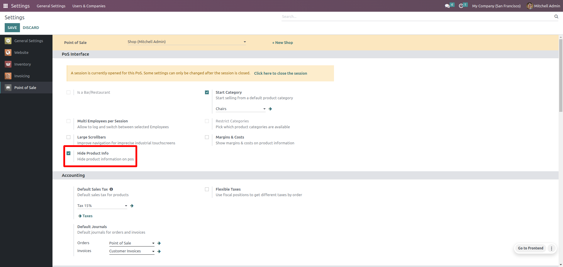 Now install the module and go to the POS Settings, you will see the boolean as Hide Product Info.