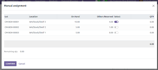 - Click the confirm button in the wizard. With that, the reserved quantity will be set/changed to follow the manual assignment. It can be checked in the detailed operations of the movement.